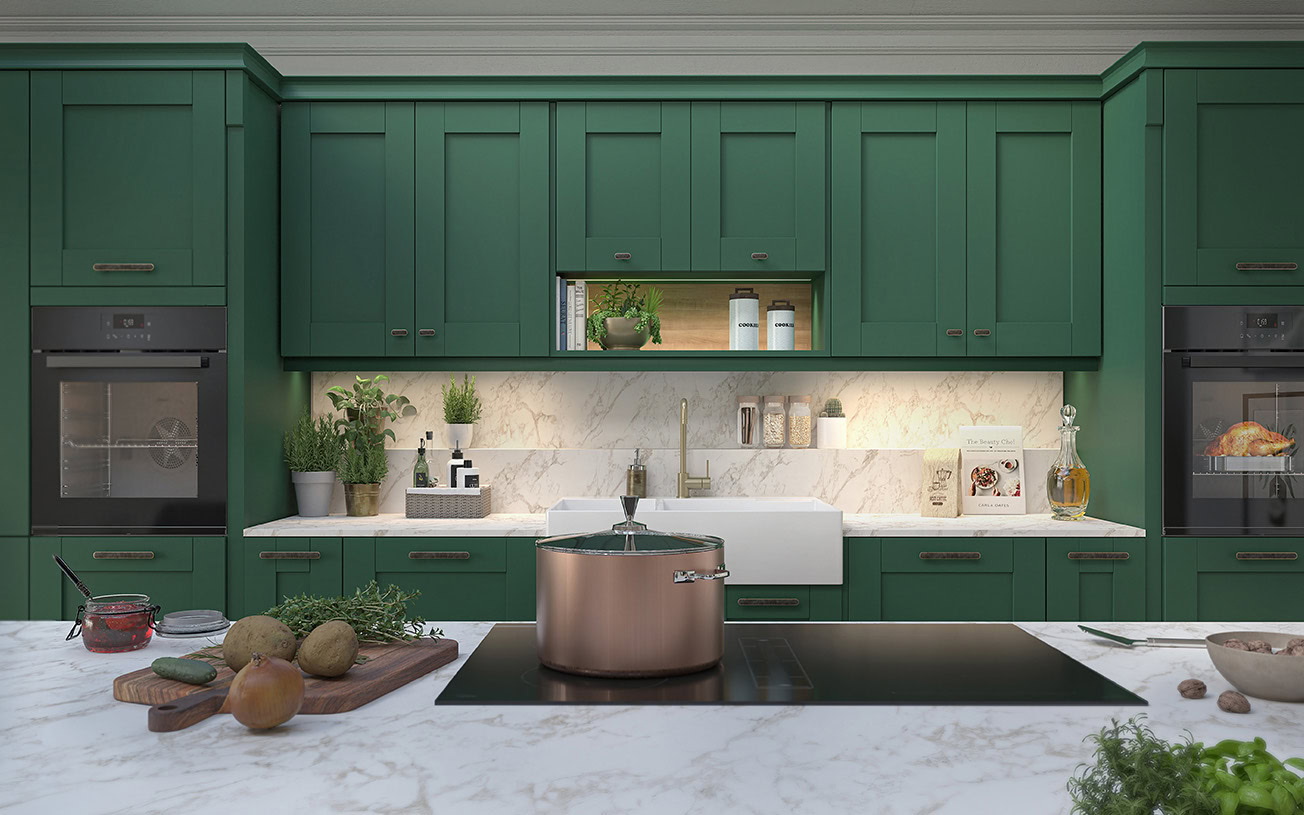 - Mørk skovgrøn eller smaragdgrøn giver køkkenet en eksklusiv og hyggelig atmosfære.