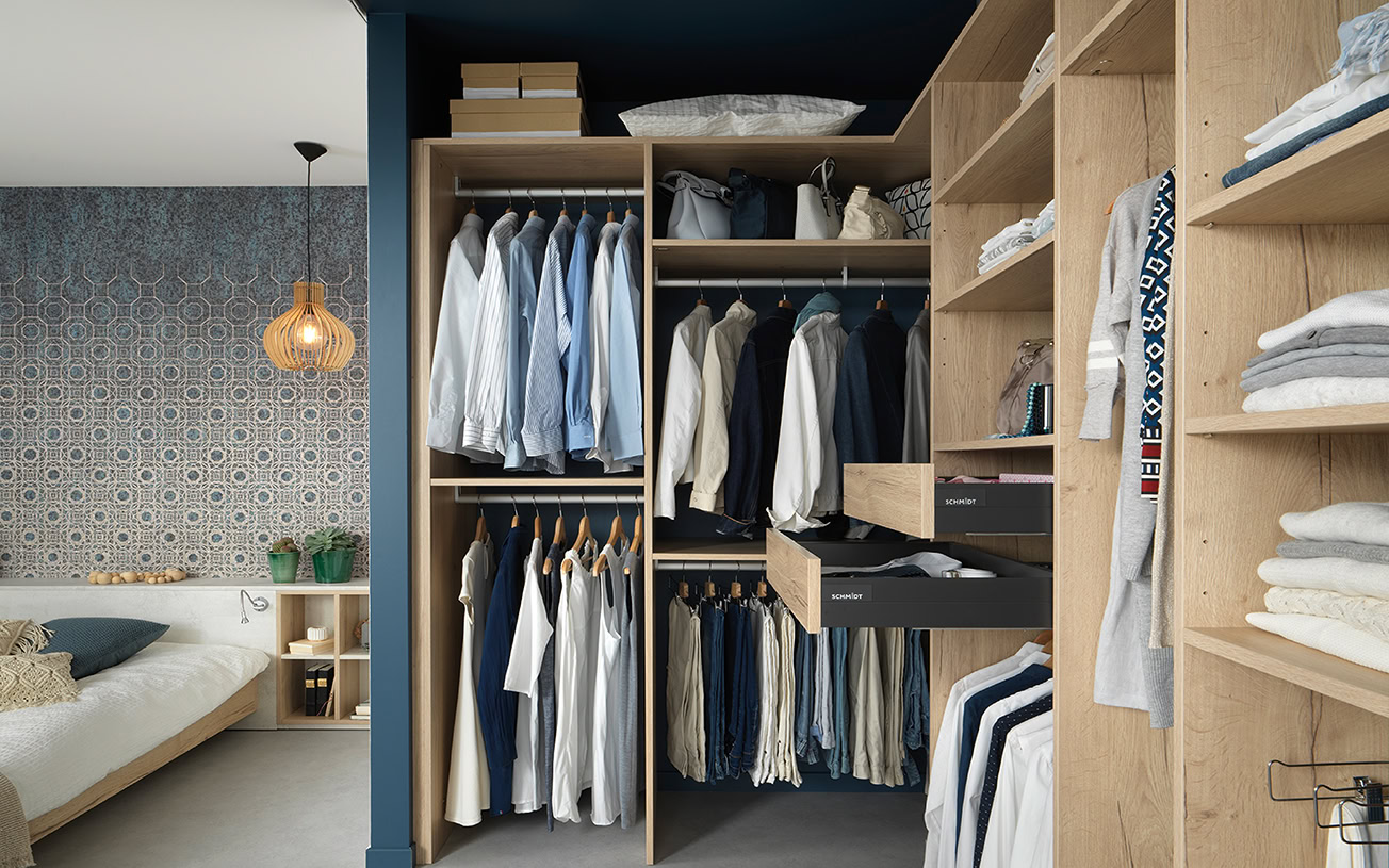 Her kan en garderobeløsning være Schmidts BLANC, Det smarte ved denne løsning er, at de åbnede og lukkede elementer kan kombineres efter dine ønsker. Således bestemmer du selv hvad der skal gemmes væk, og hvad der skal være synligt.
