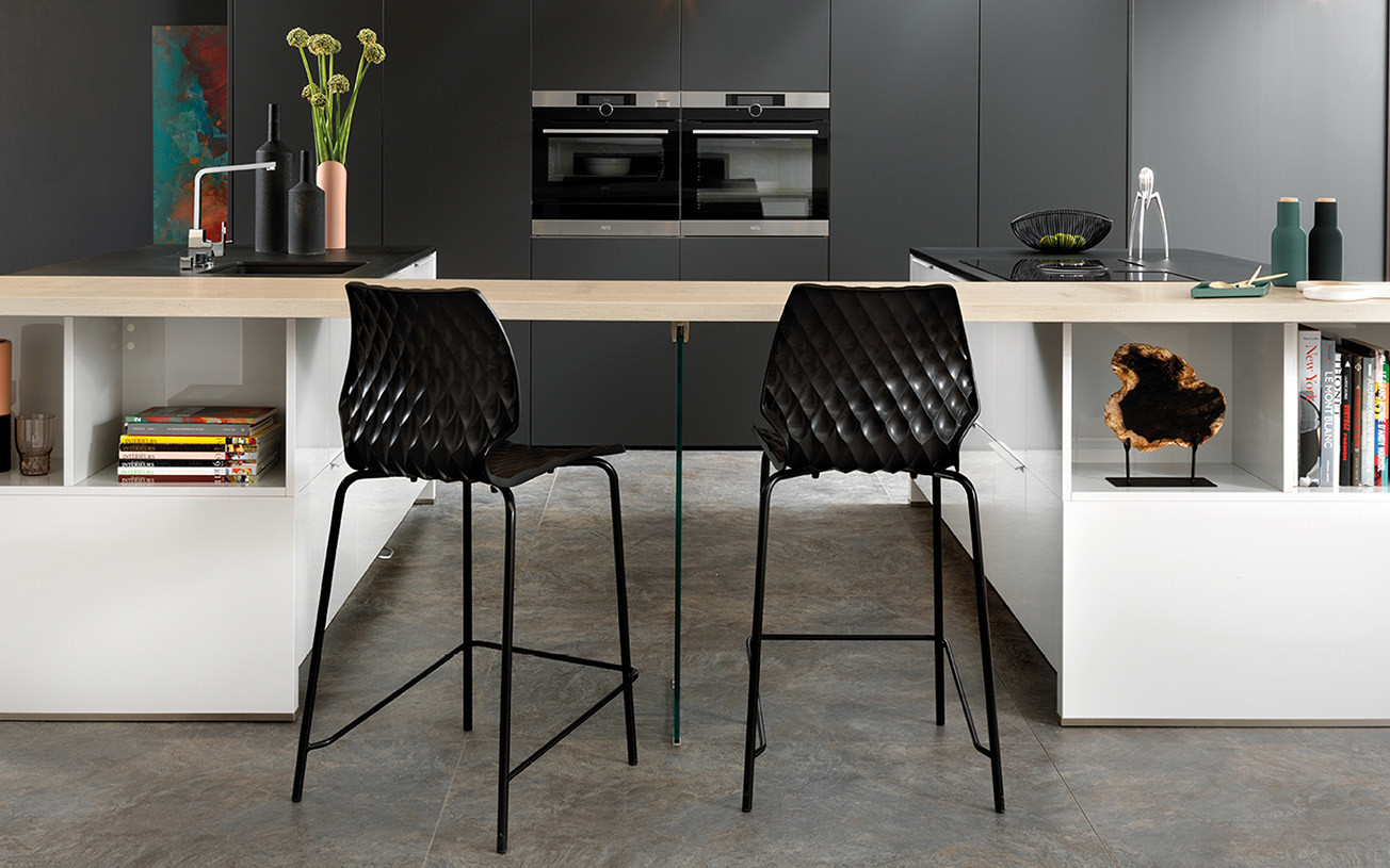 Strass Glossy-køkkenet kombinerer elegance med funktionalitet med din unikke overflade. Køkkenet har en højglans lak på ydresiden og en mat lak på indersiden, hvilket skaber en raffineret kontrast. Overfladen i højglans giver dit køkken et skinnende udseende, som reflekterer lys og får rummet til at virke større og mere luftigt. Den matte inderside giver en anti-reflekterende overflade, der er diskret og praktisk i daglig brug.
